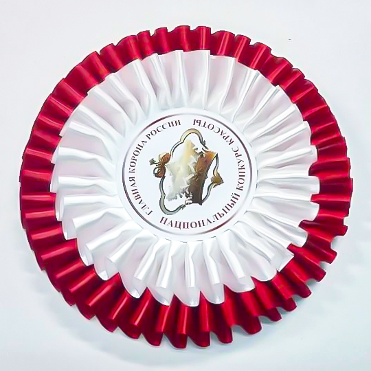 Розетка двухрядная с центр-вставкой. Диаметр 155 мм. Центр вставка 60 мм, полноцветная. Внешний ряд в тон канта ленты, внутренний ряд белый (или другой). Розетка фиксируется на ленте, сразу при сборке.